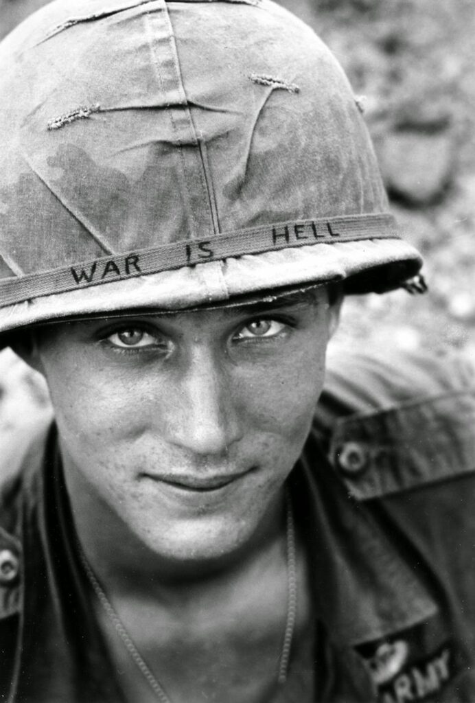 Parte do que tornou a foto tão marcante foi a justaposição do soldado — um jovem de olhos brilhantes e um leve sorriso no rosto — e as três palavras que ele escolheu para estampar em seu capacete: