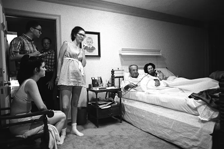 Seus confrontos com a polícia resultaram na morte de um civil e mais de 750 feridos entre manifestantes, policiais e civis. Yoichi Okamoto, o primeiro fotógrafo oficial da Casa Branca, estava no cargo há cerca de cinco anos antes da Convenção Nacional Democrata acontecer — e claramente conquistou a confiança do então presidente LBJ, que permitiu ao fotógrafo acesso total a ele, como evidenciado por esta foto tirada dentro do quarto do presidente em sua casa em Stonewall, Texas.