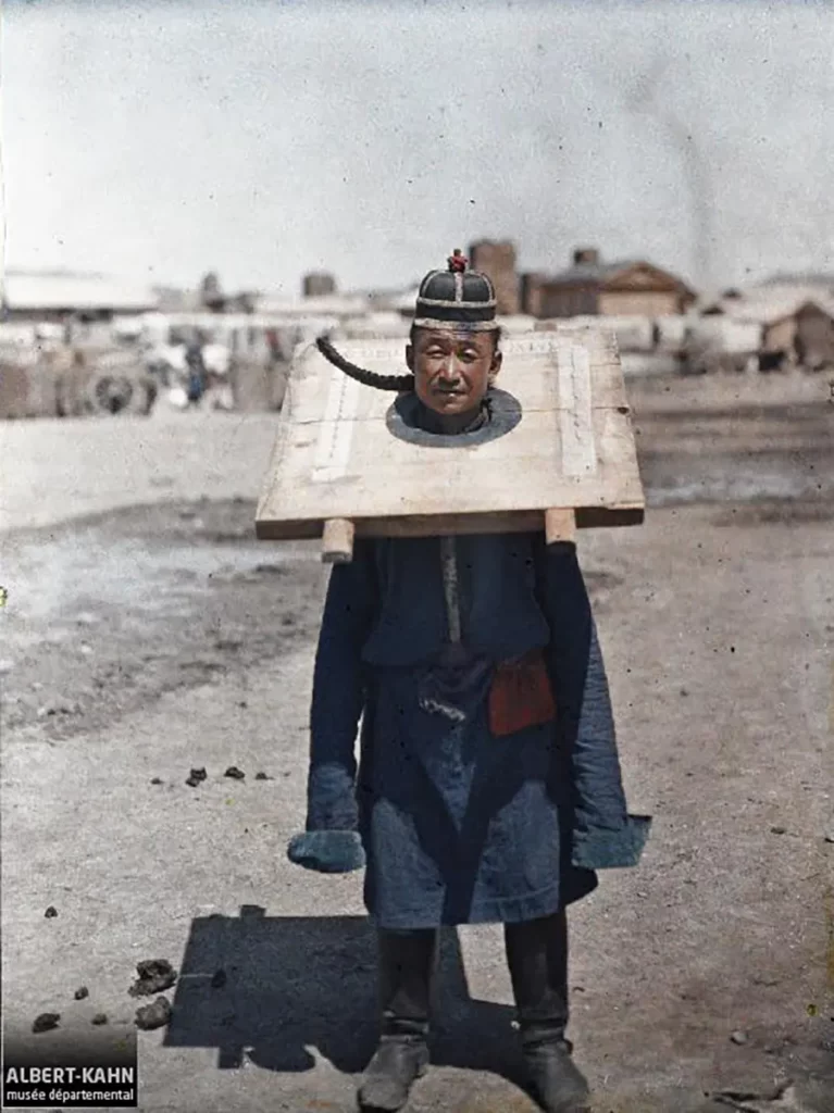A foto foi publicada pela primeira vez na edição de 1922 da National Geographic sob o título “Prisioneiro mongol em uma caixa”.
