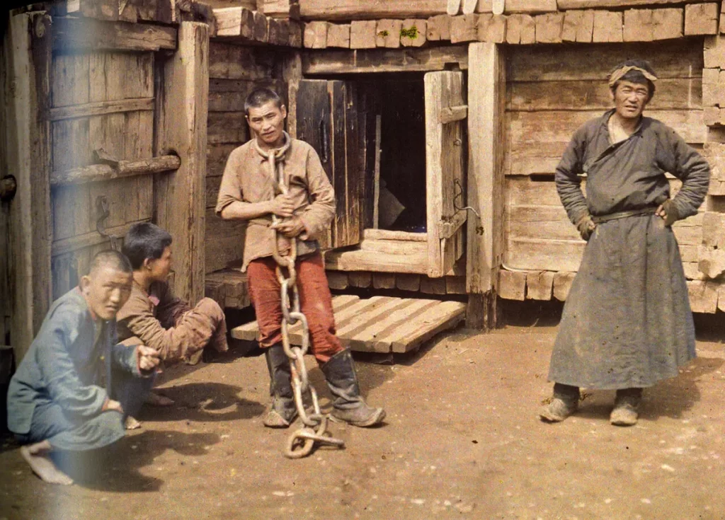 Durante sua viagem por países exóticos, Albert Kahn e Stéphane Passet visitaram a Mongólia, onde tiraram esta foto de uma mulher que foi condenada à fome lenta e dolorosa ao ser depositada em um deserto remoto dentro de uma caixa de madeira que se tornaria seu túmulo.