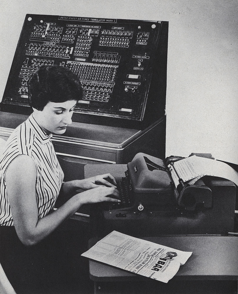 Esta fita, quando inserida em outra unidade, produz uma tradução para o inglês. Espera-se que, na década de 1970, a tradução automática da maioria dos livros e jornais estrangeiros se torne um processo rotineiro.