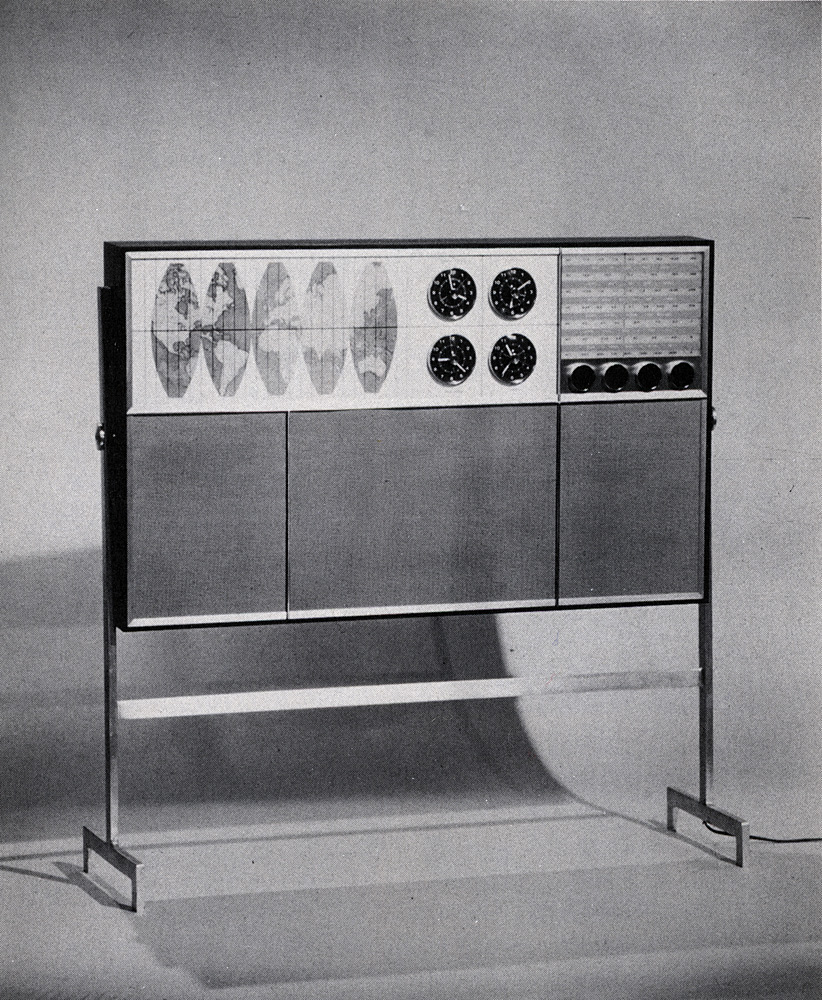 Uma luz no mapa-múndi indica a origem da transmissão, enquanto os mostradores mostram a hora em quatro fusos horários principais. A unidade, com apenas 7,5 cm de espessura, também inclui um rádio estereofônico na parte traseira.