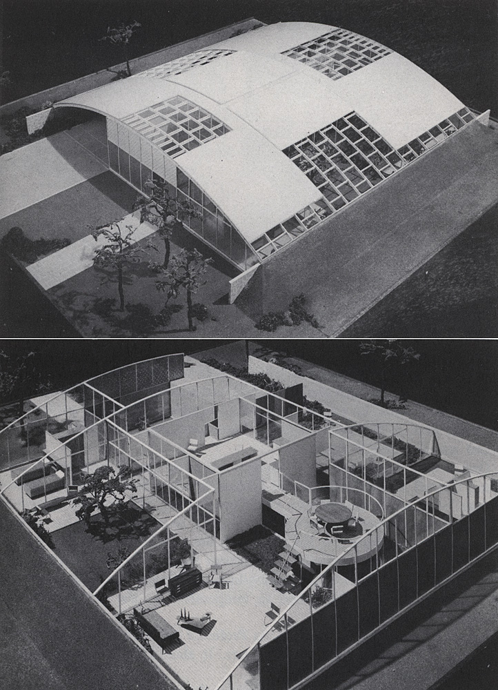 Esta casa acessível para lotes urbanos compactos utiliza arcos de aço leves para abranger as áreas de estar e de lazer ao ar livre. Com o telhado removido, o modelo apresenta um layout interno prático.