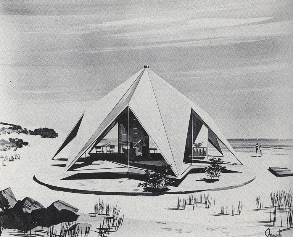 Designers vislumbram novas maneiras para as famílias aproveitarem o tempo livre no futuro. Esta casa de praia apresenta um telhado de alumínio colorido e paredes de vidro que se abrem totalmente para o exterior.