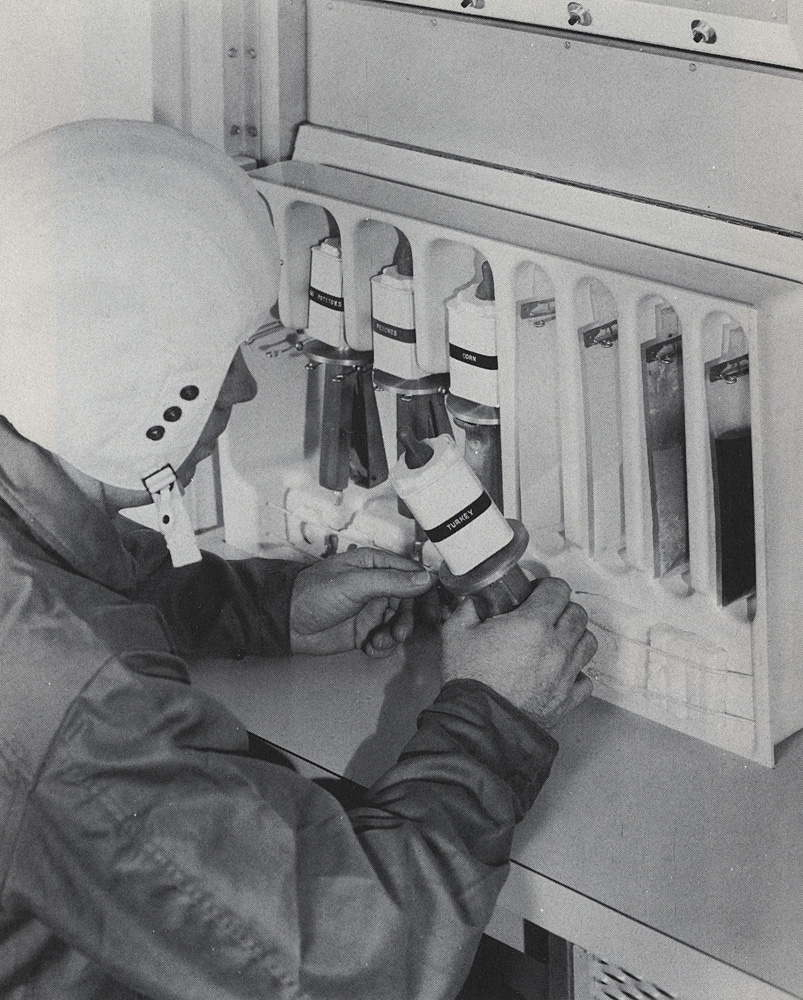 Um dispositivo de compressão é acoplado a uma lata furada, permitindo que o alimento seja empurrado por um bico diretamente para o cliente. A pesquisa sobre esse sistema continua no Laboratório Aeromédico da Base Aérea Wright-Patterson.