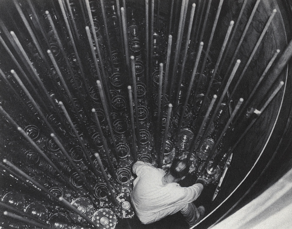Neste reator experimental de sódio, o grafite contido em 119 recipientes controla os nêutrons necessários para a fissão atômica. Os elementos combustíveis são colocados dentro de molas helicoidais dentro do tanque.