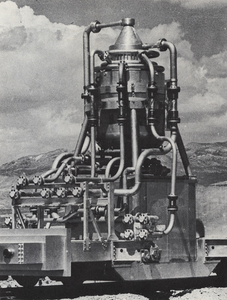 O reator “Kiwi”, mostrado aqui em fase experimental, está entre os primeiros projetos que levaram a unidades atômicas capazes de impulsionar foguetes em viagens que se estendem por milhões de quilômetros pelo espaço.