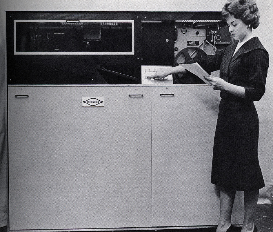 Os documentos inseridos neste dispositivo são convertidos em fita perfurada a uma taxa de 240 caracteres por segundo. A fita perfurada pode então ser lida por outra unidade para reproduzir o texto capturado pela máquina.